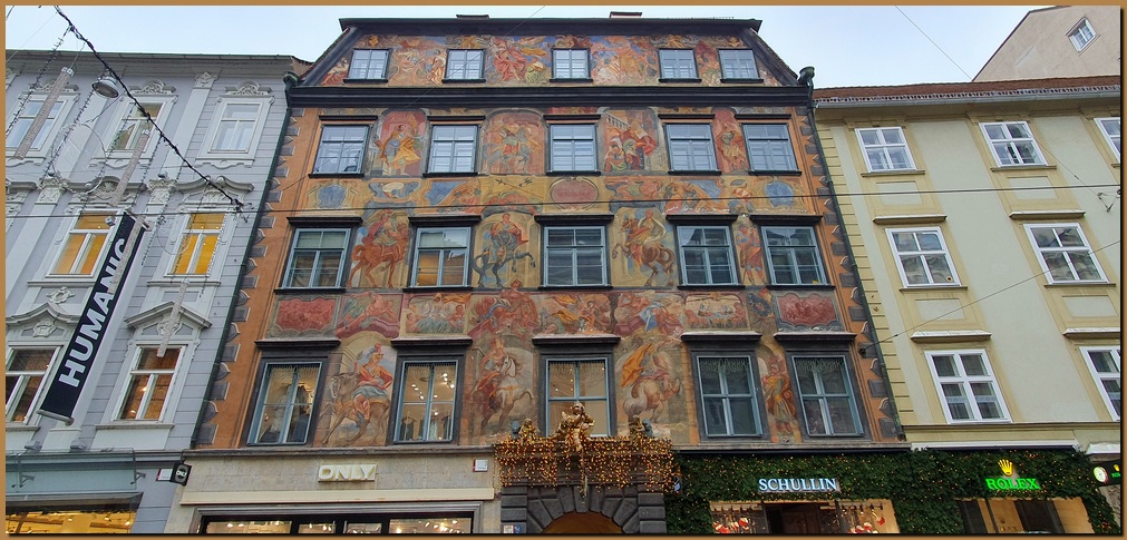 All'angolo Hauptplatz e Sporgasse si ammira la facciata riccamente stuccata della casa con il porticato "Legghaus"