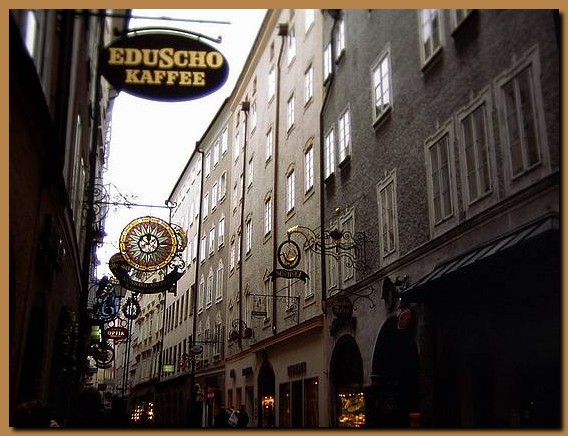 Nella foto una invitante pasticceria, dove si vendono gli immancabili cioccolatini dedicati a Mozart: i Mozartkugel, nati nel 1890, rotonde praline di marzapane al pistacchio, ricoperte di gianduia e cioccolato fondente, la cui ricetta è ancor oggi mantenuta ben celata. |
