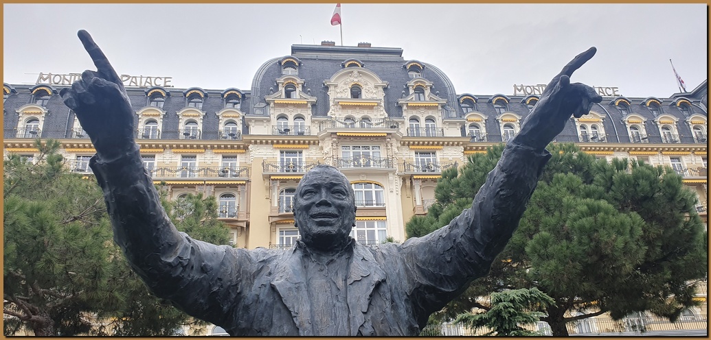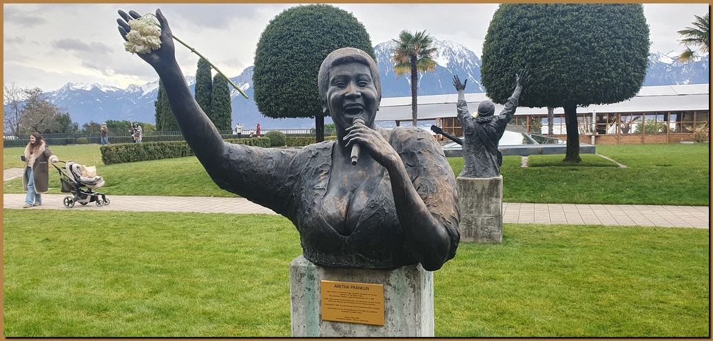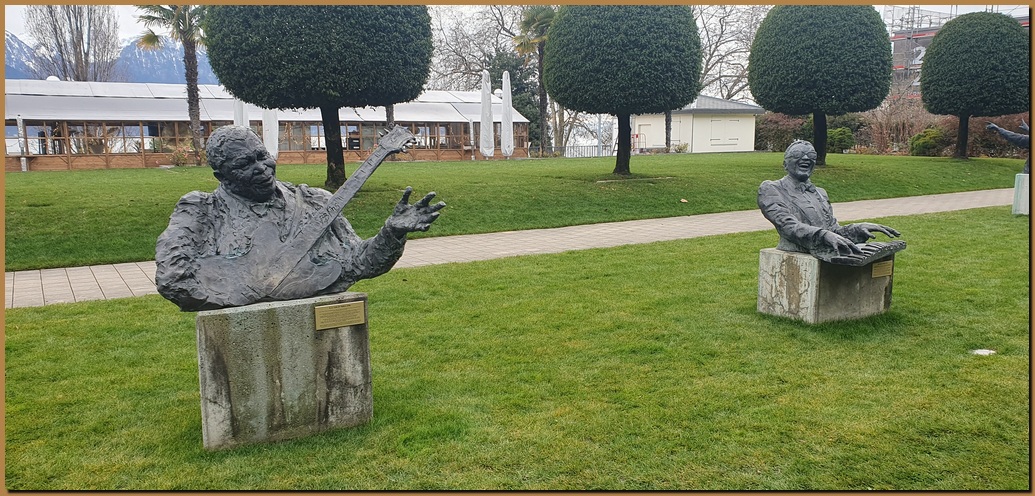 Nel Jardins du Palace, di fronte all'imponente (mega)Hotel Fairmont Le Montreux Palace, si trovano le statue di alcuni "mostri sacri" che si sono qui esibiti in passato. Nella foto a sinistra: B.B.King e Ray Charles |