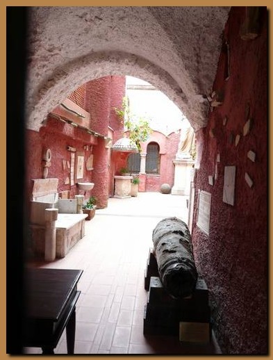 L'originale architettura della Casa Rossa si caratterizza per l'assenza di simmetria riscontrabile sia all'esterno del cortile, che all'interno dove si ritrova un minuscolo antiquarium con reperti egiziani, tegole, mosaici e piccole sculture di epoca romana ed altomedievale.