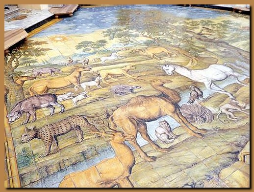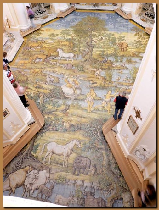 La pavimentazione in maiolica, osservabile dal basso percorrendo una passerella periferica in legno ed anche dall'alto salendo una piccola scala a chiocciola all'interno della chiesa, raffigura il Paradiso terrestre e la cacciata di Adamo ed Eva.