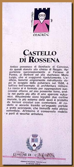 Il Castello di Rossena si erge su una rupe isolata lungo il sentiero Matildico, variante della pių famosa Via Francigena, percorso nella storia dai pellegrini in cammino verso Roma. Il cuore del feudo della celeberrima Matilde di Canossa č situato nelle prime alture appenniniche.