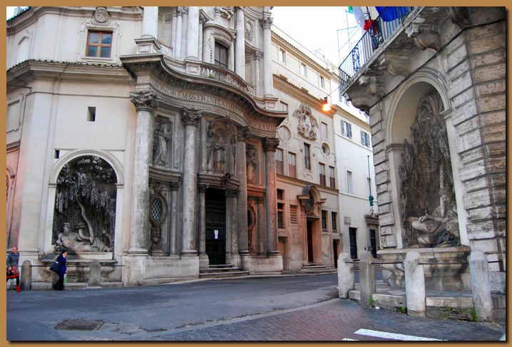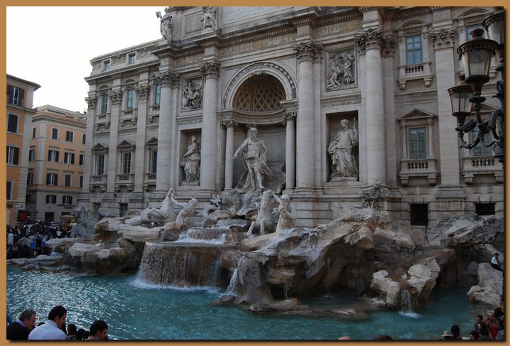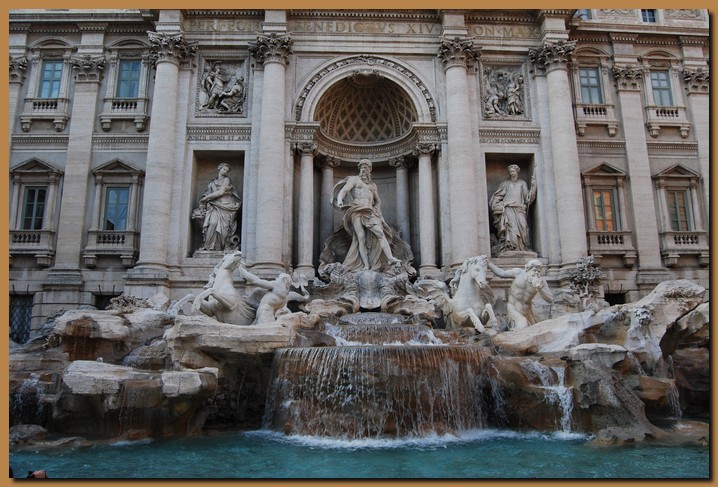 La Fontana di Trevi è la più grande fontana di Roma ed è considerata una delle più celebri fontane del mondo. Progettata da Nicola Salvi, venne completata nel 1762, si trova adagiata su un lato di Palazzo Poli. Il tema dell'intera composizione è il mare in un connubio di classicismo e barocco. Una breve scalinata poco al di sotto del livello stradale della piazza servì al Salvi come espediente per compensare il dislivello tra i due lati della piazza: il lato sinistro (quello verso il colle del Quirinale) è infatti molto più elevato rispetto all'altro. Sempre per compensare il dislivello si è anche dovuto ricorrere ad un breve parapetto per delimitare la strada, parzialmente coperto da rocce, su una delle quali è scolpito uno stemma cardinalizio raffigurante un leone rampante.