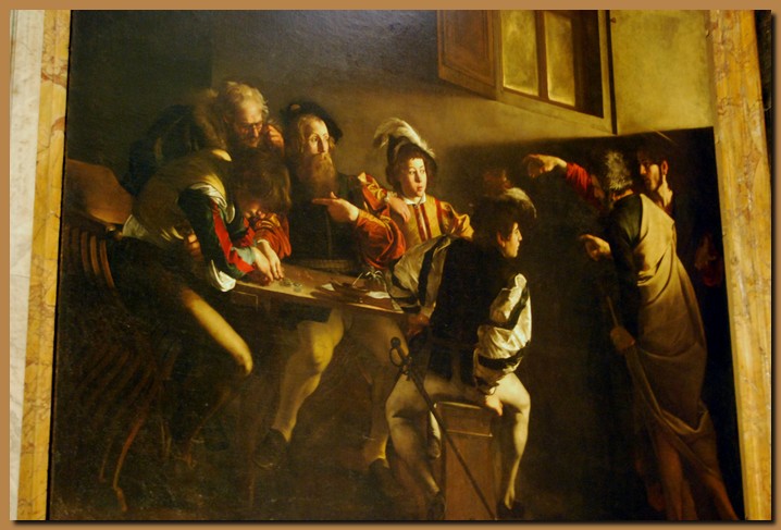 Il dipinto è realizzato su due piani paralleli, quello più alto vuoto, occupato solo dalla finestra, mentre quello in basso raffigura il momento preciso in cui Cristo indicando san Matteo lo chiama all'apostolato. Il santo è seduto ad un tavolo con un gruppo di persone, vestite come i contemporanei del Caravaggio, come in una scena da osteria. È la prima grande tela nella quale Caravaggio, per accentuare la tensione drammatica dell'immagine e focalizzare sul gruppo dei protagonisti l'attenzione di chi guarda, ricorre all'espediente di immergere la scena in una fitta penombra tagliata da squarci di luce bianca, che fa emergere visi, mani (per evidenziare e guidare lo sguardo dello spettatore sull'intenso dialogo di gesti ed espressioni) o parti dell'abbigliamento e rende quasi invisibile tutto il resto.![]()