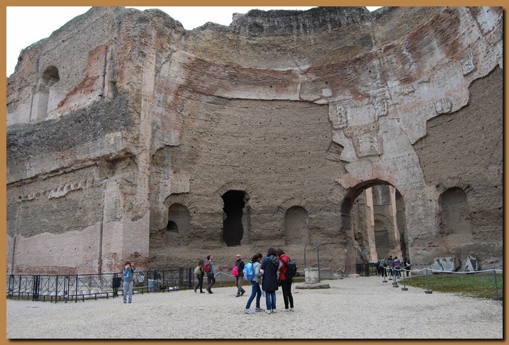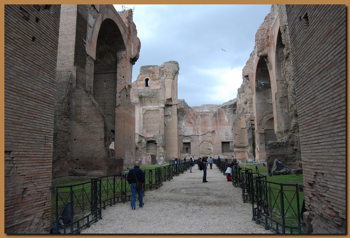 Le Terme di Caracalla potevano accogliere pił di 1.500 persone. Nella sua pił ampia estensione, recinto compreso, l'edificio misurava 337x328 metri. La sola stanza del calidarium arrivava a 140 metri, solo le terme di Diocleziano saranno pił grandi. Le terme funzionarono per 300 anni, finchč gli invasori Goti non tagliarono l'acquedotto.![]()