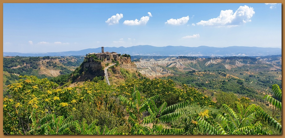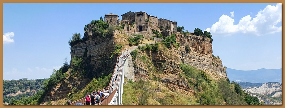 Il meraviglioso borgo di Civita di Bagnoregio è un piccolissimo centro dove il tempo sembra essersi fermato e dove si può giungere soltanto a piedi, percorrendo un ponte in cemento armato realizzato a vantaggio dei pochi cittadini rimasti e dei turisti che la visitano da tutto il mondo. Il ponte dallo stile moderno purtroppo contrasta visivamente con l'atmosfera medievale e la natura circostante.