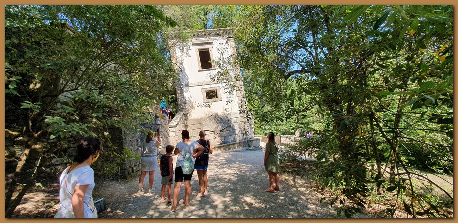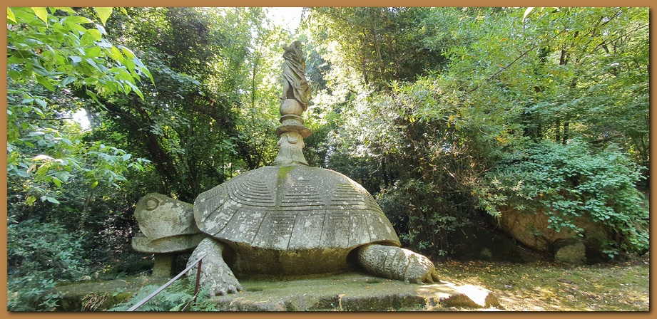 La gigantesca tartaruga, sormontata dalla Fama alata, con un gioco di proporzioni all'incontrario tipico della volontà di trasgredire le regole che domina nel Parco di Bomarzo. E' evidente nella figura femminile posta sul dorso della tartaruga la classica iconografia della Fama alata.