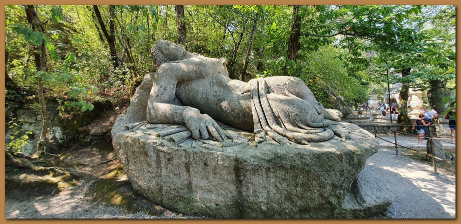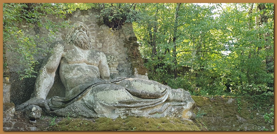 "Proteo": la divinità mitologica è qui rappresentata con la bocca spalancata e con in testa un globo con i simboli araldici degli Orsini e sopra un Castello, forse quello di Bomarzo. Proteo, vecchio genio del mare, era stata insignito da Poseidone, signore di tutti i mari, del ruolo di custode delle foche e di ogni altra specie animale che popolasse le acque salse.![]()