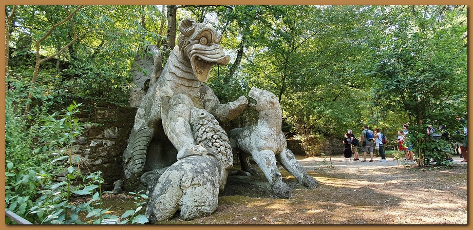 "Il Drago": c'è chi ha voluto vedere in questa scultura del Parco dei Mostri di Bomarzo un riferimento all'Estremo Oriente e dal fascino che l'esotismo di quelle terre esercitava su Vicino Orsini. Esiste un'incisione di Lucantonio degli Uberti, ricavata da un disegno di Leonardo da Vinci, che rappresenta proprio il soggetto di Bomarzo, un Drago che lotta con i leoni.
