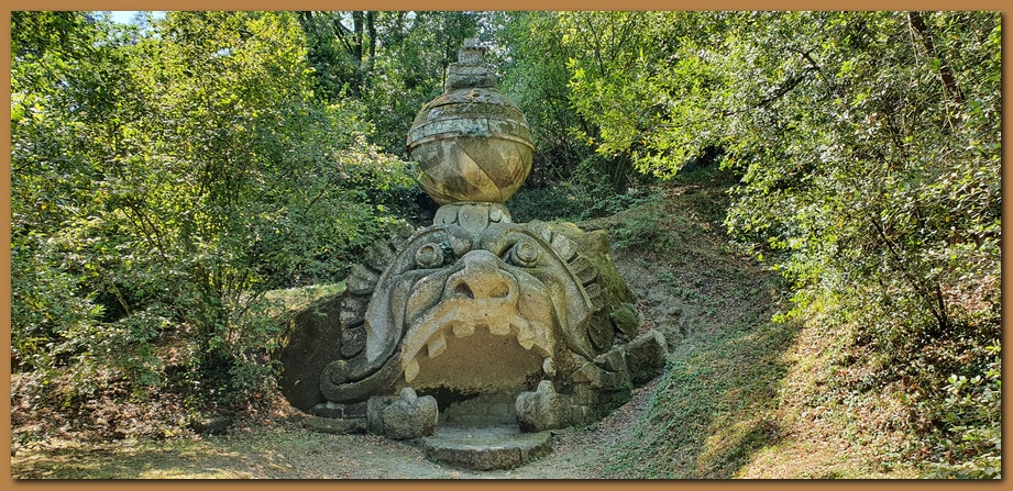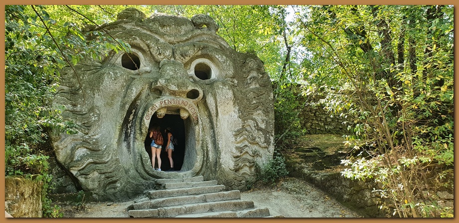 "L'orco": questa grande scultura, un enorme volto con la bocca spalancata e lo sguardo terrorizzante, è il simbolo del Parco dei Mostri di Bomarzo e racchiude in sè molti dei significati del "Giardino incantato". Forse vuole incutere terrore ed anche meraviglia e comunque invita il visitatore a penetrare all'interno della sua bocca; a che servirebbe sennò l'ampia scalinata? Quella bocca spalancata è l'ingresso dell'Inferno ed al suo interno c'è un tavolo in pietra che invita ad entrare e banchettare. La scritta che compare attualmente intorno alle sue fauci "OGNI PENSIERO VOLA", non è sicuramente quella originaria: un disegno di Giovanni Guerra del 1598 che riproduce l'Orco di Bomarzo riporta anche la scritta, allora ben conservata: "LASCIATE OGNI PENSIERO VOI CH'INTRATE", con evidente riferimento all'Inferno dantesco.![]()
