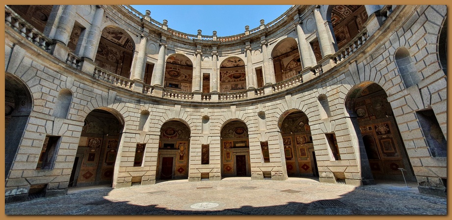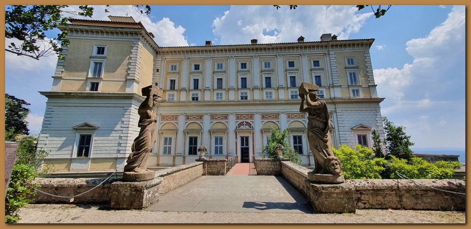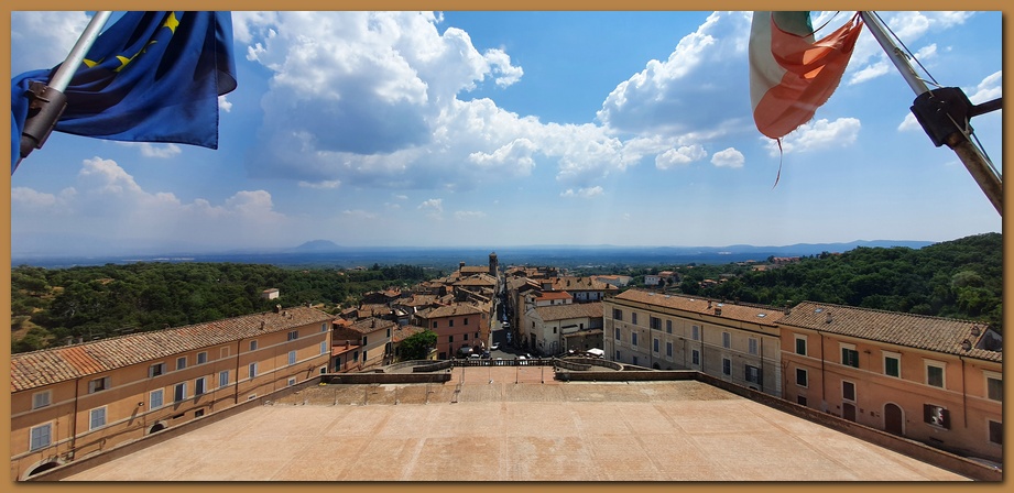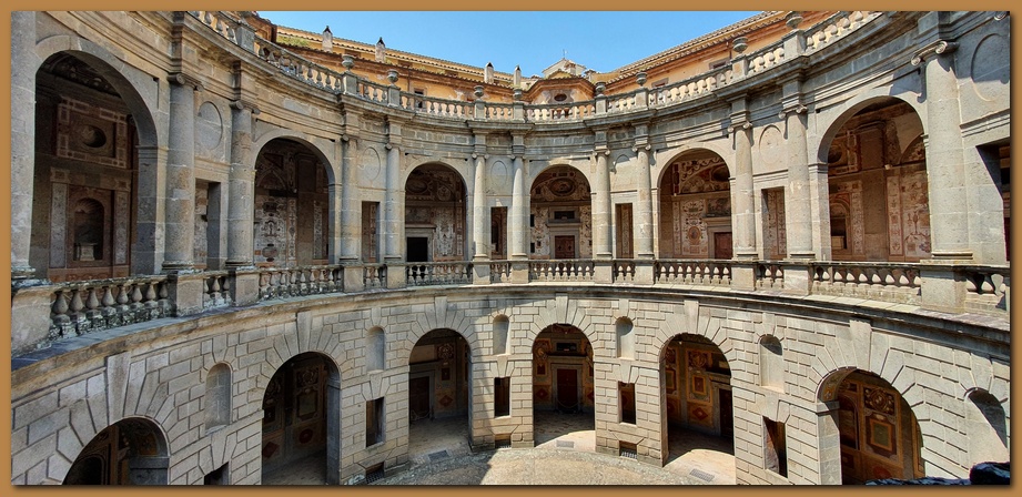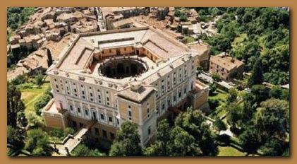 Dal balcone centrale della facciata del palazzo si domina la scalinata d'ingresso ed il sottostante paese di Caprarola.![]()