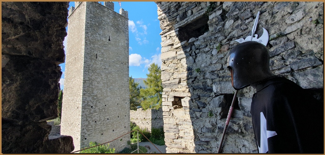 Stendardi, armature e cimeli vari accompagnano la salita a piedi in cima alla Torre, con sottofondo musicale medievale.