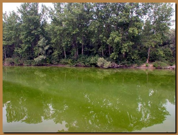 vegetazione selvaggia e acqua stagnante intensamente verde, mossa solo dal