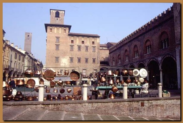 A destra il Palazzo della Ragione, con merli e trifore, eretto a metą del XIII secolo. |