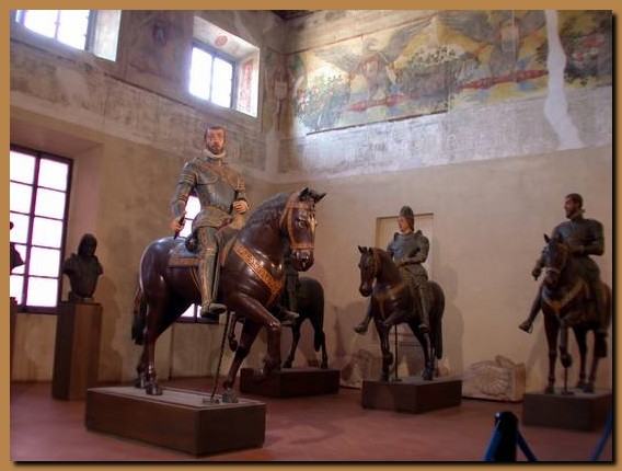 La Sala delle Guardie (nella foto) contiene quattro statue equestri (le uniche sopravvissute ad un incendio) che rappresentano alcuni Gonzaga tra cui Vespasiano stesso, in primo piano, e suo padre. |