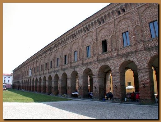 Nella foto il porticato esterno, che dà sulla piazza d'Armi, attuale piazza Castello. Oggigiorno si tengono sotto di esso mercatini di ogni genere. |