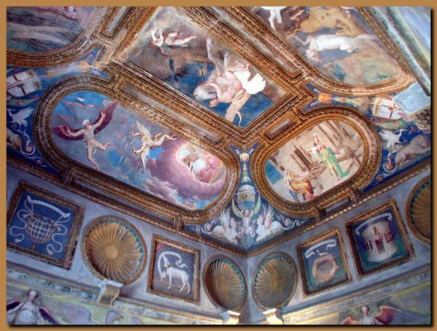 internamente numerose stanze e saloni riccamente decorati a fresco (un soffitto nella foto) ancora ben conservati nonostante i saccheggi da parte dei soldati di Napoleone. I rivestimenti in oro zecchino delle decorazioni sono stati totalmente asportati.