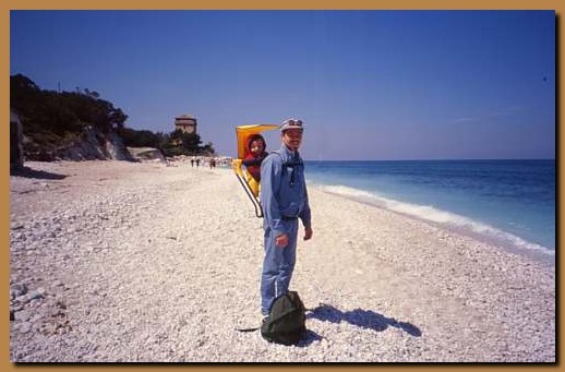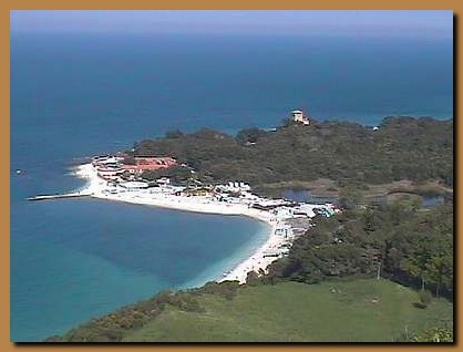 La bianca sabbia della spiaggia. La torre di guardia sullo sfondo, ora trasformata in residenza privata.