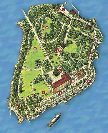 Vialetti molto ordinati e puliti guidano il visitatore lungo un percorso perimetrico dell'isola.
