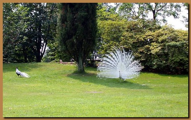 Tra la vegetazione spunta ogni tanto un pavone, sia quello classico blu e verde, sia la varietà bianca,