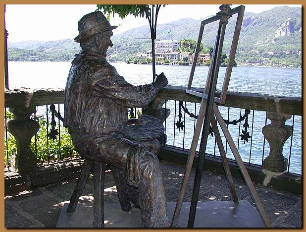 La statua del pittore che mira il lago e l'Isola di S.Giulio antistante