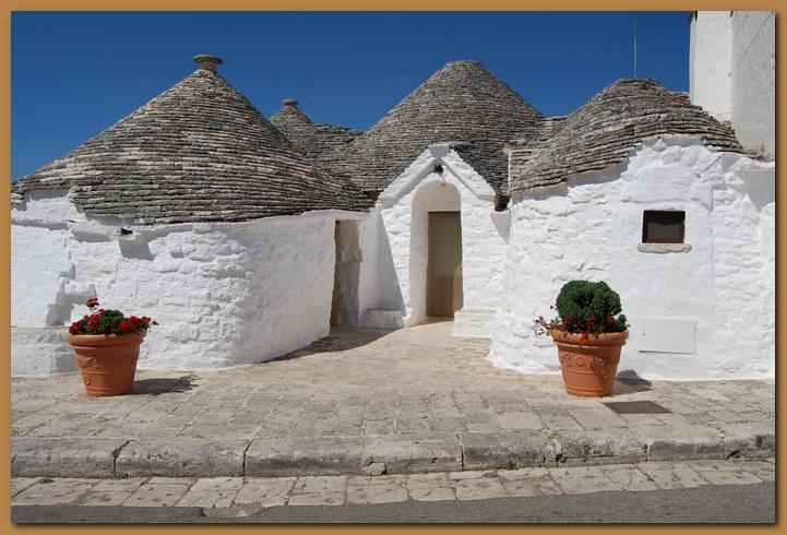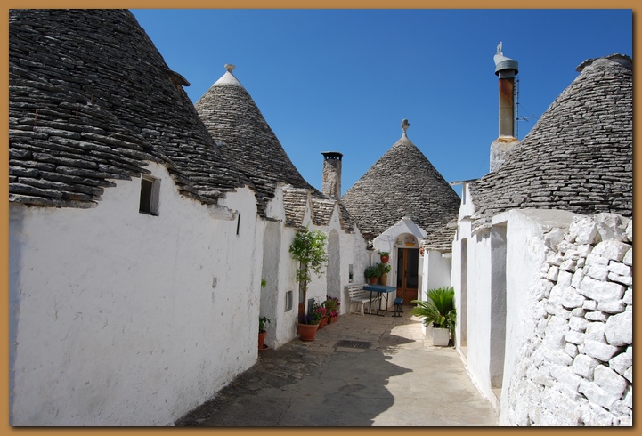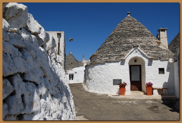 Le dimore a trullo sono dominate dall'uso esterno della pietra a sfoglie, le 'chiancole', che rivestono il cono e creano