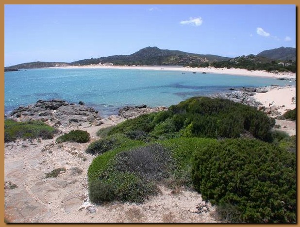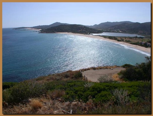Sullo sfondo si trovano le spiagge racchiuse tra Capo Spartivento e Porto Teulada. E' visibile anche la famosa laguna di Chia, separata dal mare da un lembo di sabbia. |
