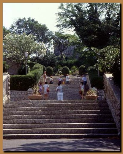 Tra il fogliame del giardino del Balio, al termine della scalinata, si intravede il castello di Pepoli