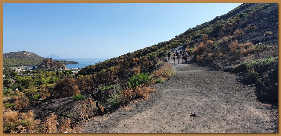Il sentiero, che parte dal porticciolo e sale lungo il fianco della montagna, offre incantevoli viste sull'arcipelago: nella foto, di fronte l'isola di Lipari, a sinistra Salina e a destra, sullo sfondo, Panarea.
