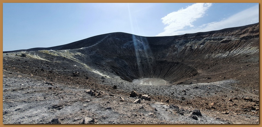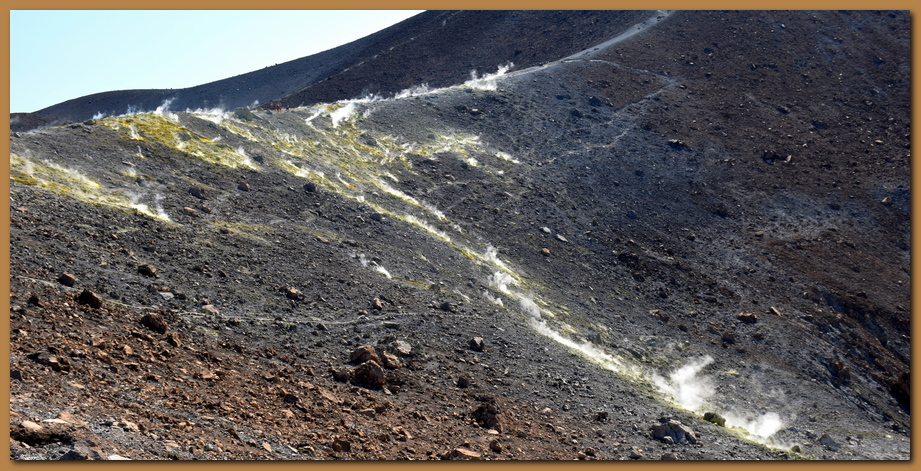 Nella foto si osservano le numerose fumarole che continuano ad emettere acido borico, cloruro di ammonio, zolfo, che alimentano un complesso industriale per la produzione di zolfo