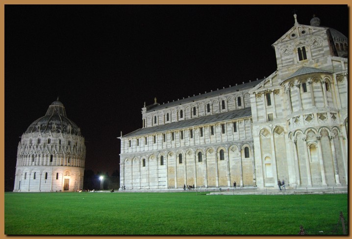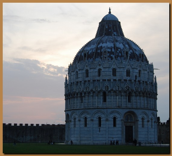 Nella foto il Battistero di Pisa, dedicato a San Giovanni Battista, s'innalza di fronte alla facciata ovest della Primaziale, nella Piazza del Duomo, vicino al Camposanto monumentale e alla Torre pendente. |