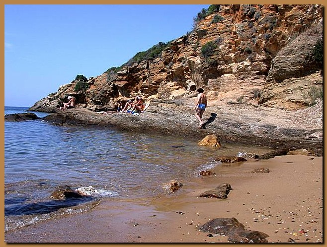Spiaggia classica, con molti ombrelloni e poca zona di spiaggia libera, a ridosso degli scogli.