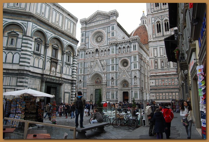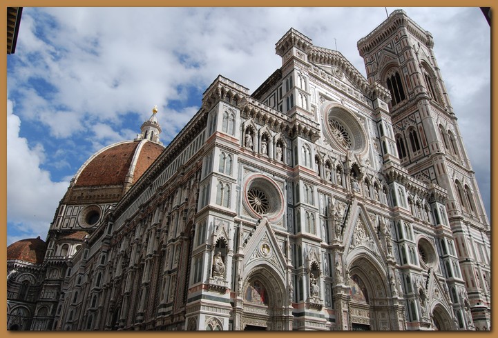 La cattedrale di Santa Maria del Fiore è il Duomo di Firenze e si affaccia sull'omonima piazza. Nel 1971 venne considerata la quinta chiesa d'Europa per grandezza, dopo la Basilica di San Pietro, la Cattedrale di San Paolo a Londra, la Cattedrale di Siviglia e il Duomo di Milano. È lunga, infatti, 153m mentre il basamento della cupola è largo 92 braccia fiorentine, pari a circa 54m. Ha una pianta peculiare, composta da un corpo basilicale a tre navate saldato ad una enorme rotonda triconca che sorregge l'immensa Cupola del Brunelleschi. Al suo interno è visibile la più grande superficie mai decorata ad affresco: 3600 m², eseguiti tra il 1572-1579 da Giorgio Vasari e Federico Zuccari.
