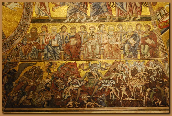 La rappresentazione dell'Inferno, attribuita a Coppo di Marcovaldo, è dominata dal grande Satana cornuto, su un trono infiammato, che sgranocchia un uomo mentre dalle orecchi gli escono due serpenti che addentano altrettanti dannati. Mostri a forma di serpente, di rana o di lucertola escono dal suo corpo e infieriscono sui dannati, che il diavolo calpesta. I dannati sono gettati in voragini dai numerosi diavoli, impiccati, mutilati, arsi allo spiedo, sbattuti o obbligati a bere oro fuso; un gruppo di dannate è avvolto dalle fiamme.