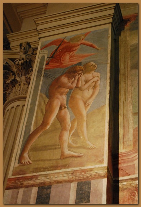 La scena della Genesi con la Cacciata dal Paradiso Terrestre, capolavoro di Masaccio. In quest'opera, vera e propria frattura rispetto al filone tardogotico del passato, è scomparsa la compostezza di Masolino e i personaggi sono ritratti in una cupa disperazione, appesantiti sotto l'angelo che con la spada sguainata li espelle con volontà perentoria, con un'intensità fino ad allora inedita in pittura. Gli stessi Michelangelo e Leonardo si recarono nella Cappella per studiare gli spunti innovativi I gesti sono eloquenti: mentre escono dalla porta del Paradiso, da dove provengono alcuni raggi divini, Adamo si copre il volto con le mani dallo sconforto e dal senso di colpa, Eva nasconde le nudità con vergogna e piange urlando, con una dolorosa espressione sul volto. In alto l'angelo della giustizia, con la spada, indica loro con durezza la via. I corpi sono volutamente massicci, sgraziati, realistici, con alcuni errori (come la caviglia di Adamo) che però non fanno che accrescere l'immediatezza espressiva dell'insieme. Le fronde che coprivano le nudità di Adamo e di Eva sono state rimosse nel restauro del 1990 (foto sotto)