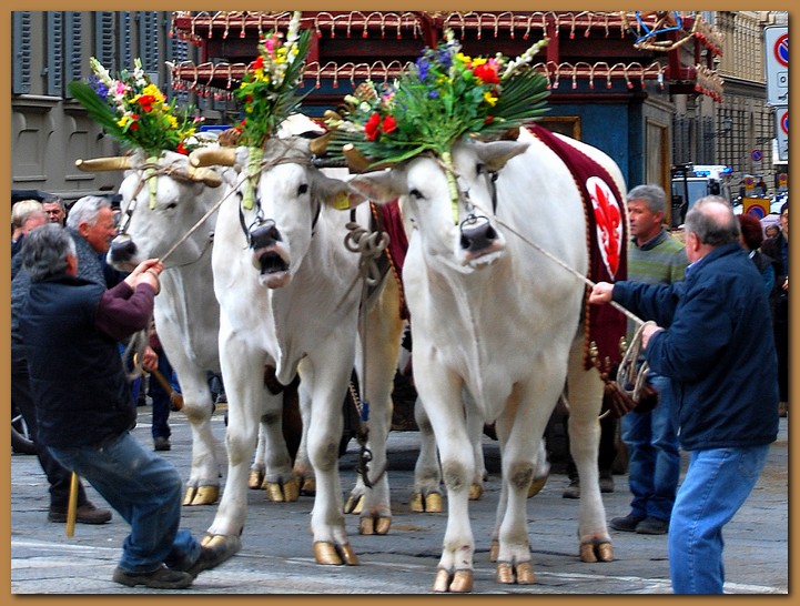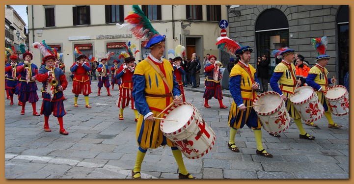 Il Carro, trainato da candidi buoi, arriva in Piazza del Duomo insieme ad un corteo di tradizionali figuranti in costume, trombettieri e sbandieratori.