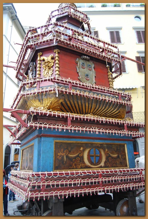 Gli storici ci hanno tramandato che dopo la liberazione di Gerusalemme, nel giorno del Sabato Santo, i crociati si radunarono nella Chiesa della Resurrezione e, in devota preghiera, consegnarono a tutti il fuoco benedetto come simbolo di purificazione. A questa cerimonia risale l'usanza pasquale di distribuire il fuoco santo al popolo fiorentino. Con l'andar del tempo lo svolgimento della festa divenne sempre più articolato per cui venne introdotto l'uso di trasportare l fuoco santo con un carro dove, su un tripode, ardevano i carboni infuocati. Non si conosce quando, in sostituzione del tripode, si usarono i fuochi artificiali per lo "scoppio del carro" ma si ritiene che ciò risalga alla fine del Trecento.![]()
