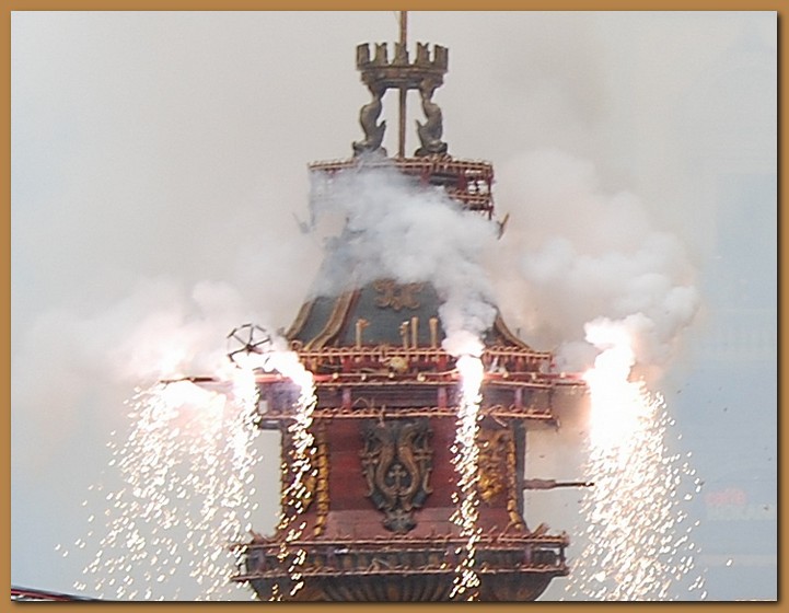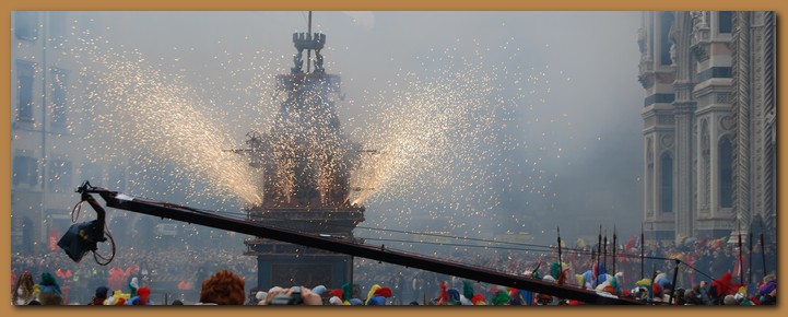 Il susseguirsi di esplosioni e spettacoli pirotecnici dura 20 minuti circa e simboleggia la distribuzione a tutta la città del fuoco benedetto. L'imponente mole dell'antico carro si avvolge puntualmente di nubi e scoppi come se l'aria stessa emettesse scintille sempre più luminose.