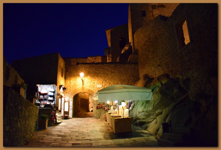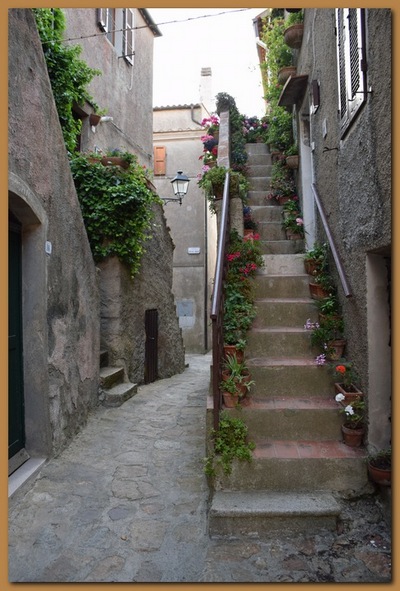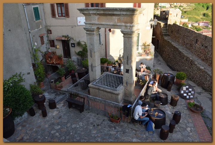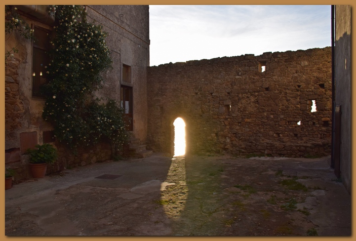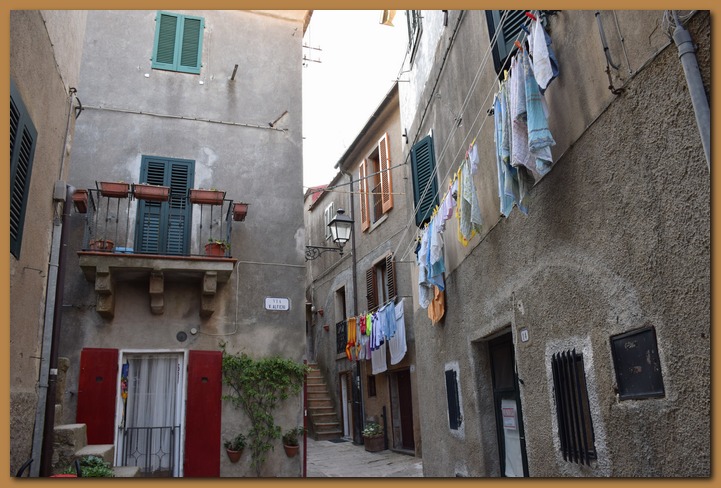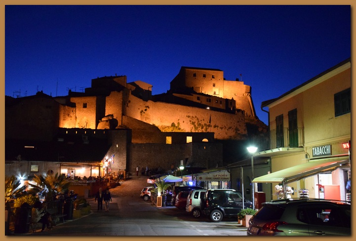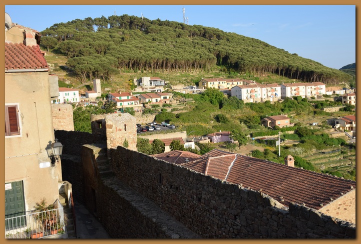 Il borgo medievale, affascinante per la struttura imponente delle sue mura (XI sec), appare ancora più suggestivo se si segue il percorso lungo i camminamenti tra feritorie e trioni (torrioni), o si esplorano i suoi vicoli sbalzati e interrotti da scale e baschetti (tipiche terrazze con gradini esterni alle abitazioni). Il caratteristico ingresso principale, a tre porte addossate a ciclopici massi di granito, testimonia ancora oggi i tempi delle incursioni piratesche e le signorie dominanti, come mostra lo stemma mediceo sull'ultima arcata.