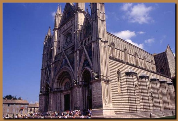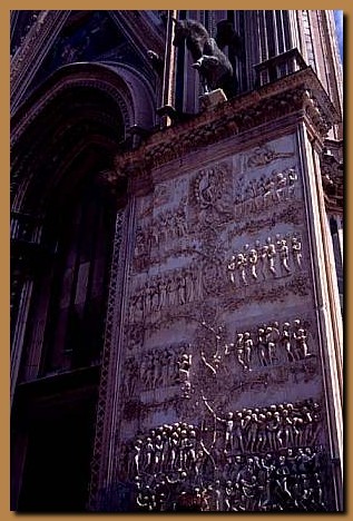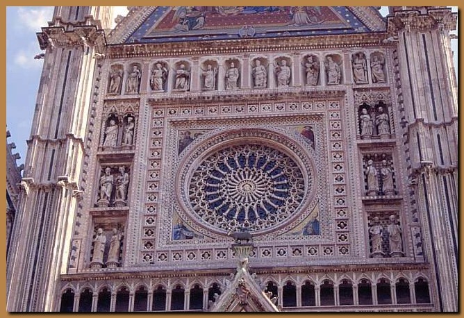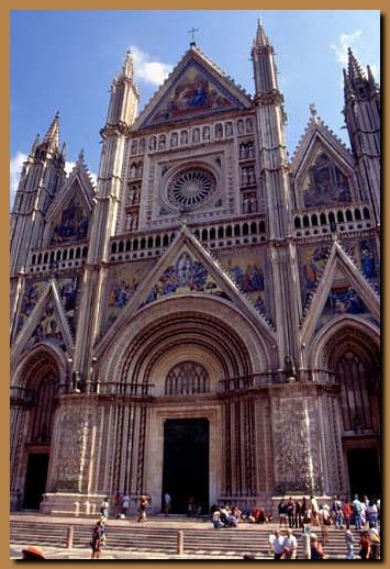 La mirabile facciata, disegnata dal Maitani, e terminata nel XVI secolo, ricca di sculture e splendente di mosaici, è divisa verticalmente da 4 pilastri terminanti in guglie. In basso si aprono 3 portali cuspidati. |