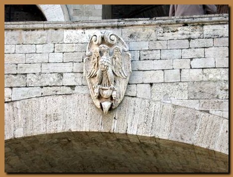 a sinistra l’aquila bronzea, che campeggia sulla facciata del Palazzo dei Priori (XIV sec) a destra l'aquila sulla scalinata del Palazzo Comunale |