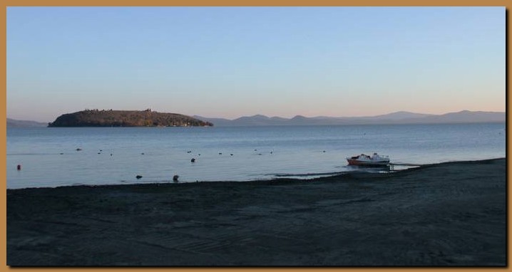 Raggiunge i 6 metri di profondità e i suoi emissari sono artificiali: uno sotterraneo scavato dai romani, uno completato il secolo scorso a scopi irrigui. In prossimità della riva settentrionale si trovano 2 isole (Maggiore e Minore). Sulla stessa riva nel 217 a.C. Annibale attirò in un agguato i romani e li sconfisse. A sud-ovest invece si trova la più vasta isola del lago (isola Polvese - nella foto). E’ un lago pescoso, circondato da canneti, dal 1995 Riserva Naturale che fa da sosta invernale a numerosi uccelli migratori soprattutto cormorani e folaghe |