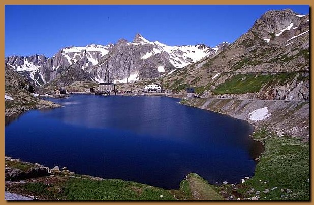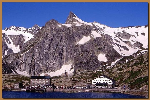 Il confine tra Italia e Svizzera. Si può vedere (in piccolo) anche la statua di S.Bernardo che si staglia sulla neve, a metà tra le due case.