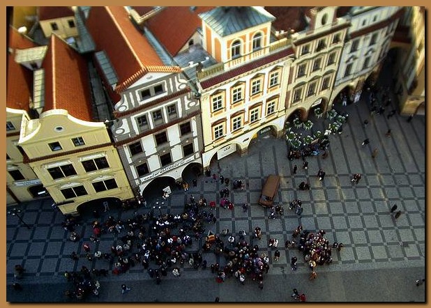Si scorgono la Chiesa di Thyn e, sullo sfondo, la Torre delle Polveri
