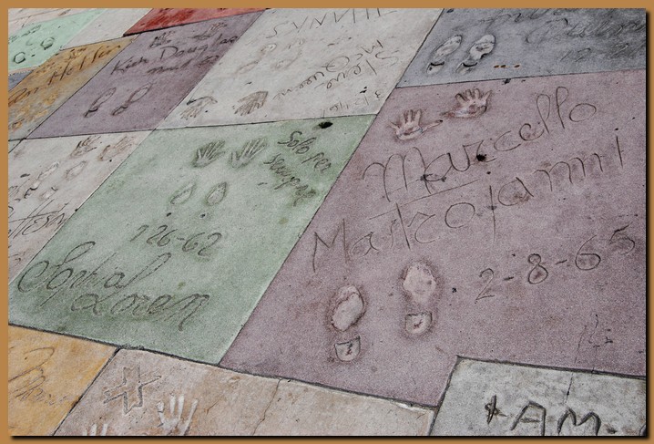 Nel piazzale davanti al Chinese Theater ci sono i calchi delle mani e dei piedi dei grandi attori come i piedini di Shirley Temple, i tacchi a spillo di Marilyn Monroe, ma anche le zampe di Paperino e le impronte di R2-D2, robot di guerre stellari! La tradizione nacque dal muratore francese che partecipò alla costruzione del teatro: secondo l'usanza dei suoi antenati, che avevano costruito Notre Dame, era importante a fine lavoro lasciare un segno!