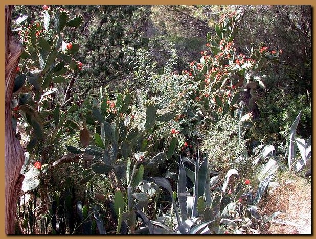 Lungo il sentiero che porta alla baie sabbiose si trovano numerosi esemplari di enormi cactus in fiore, agavi, rosmarino selvatico, bouganvulle coloratissime... uno splendido giardino.