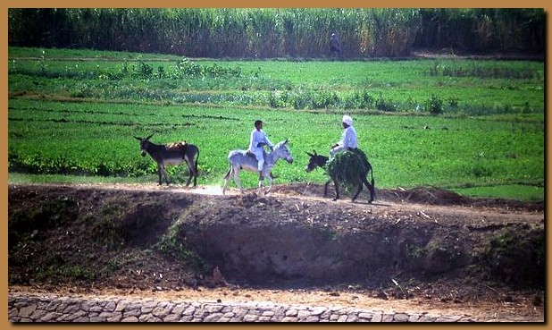 Gli asinelli, mezzo di trasporto frequente nei campi coltivati lungo il fiume