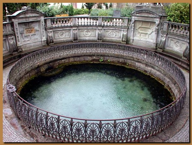 Nella foto la vasca della sorgente e sullo sfondo il Palazzo |