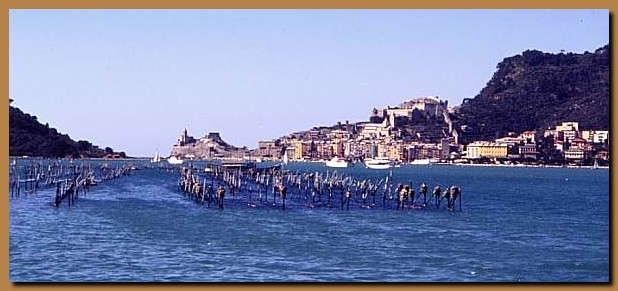 Nella foto si può vedere un allevamento ittico. Sullo sfondo si riconosce molto bene Portovenere. |