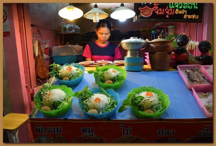 Nel centro della cittadina di Chiang Rai si svolge ogni sera il mercato notturno. Accanto ai negozi vengono montate bancarelle che vendono prevalentemente cibo, ma anche indumenti e articoli di artigianato vario per turisti.